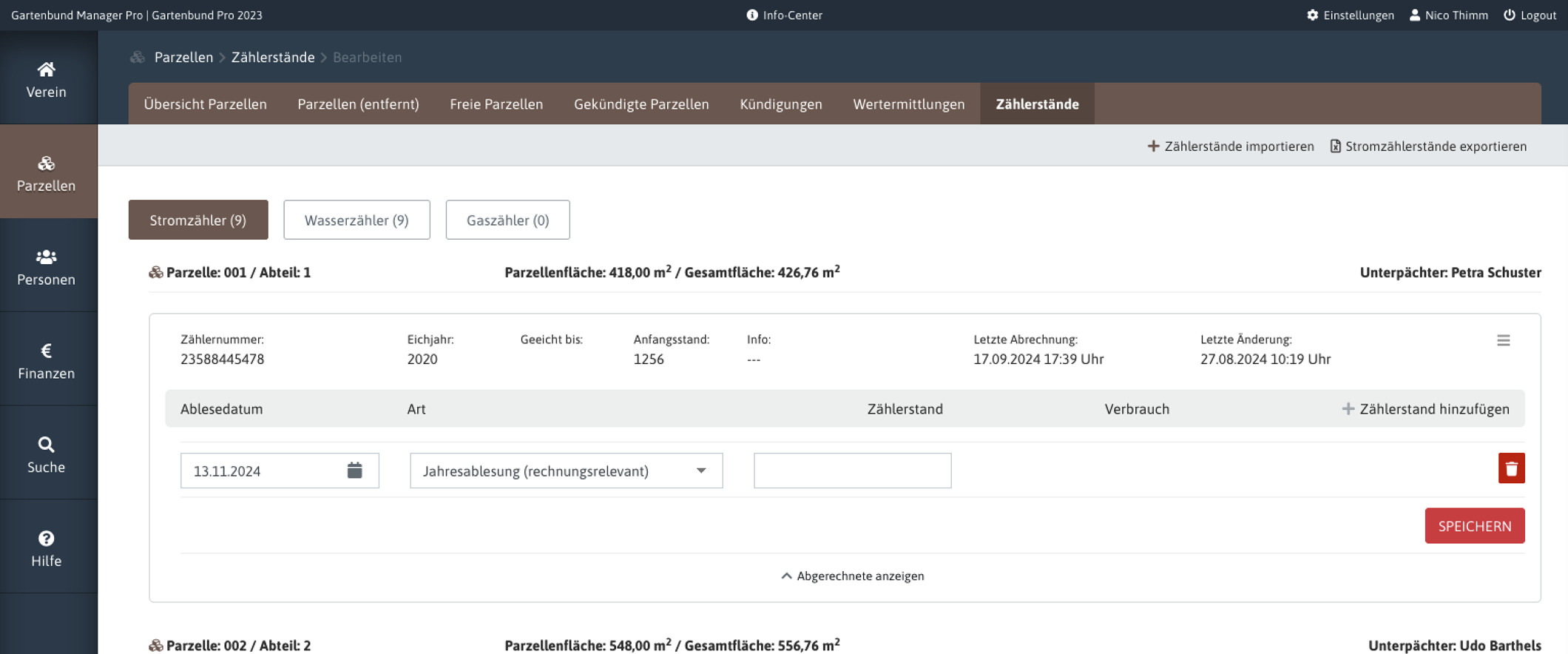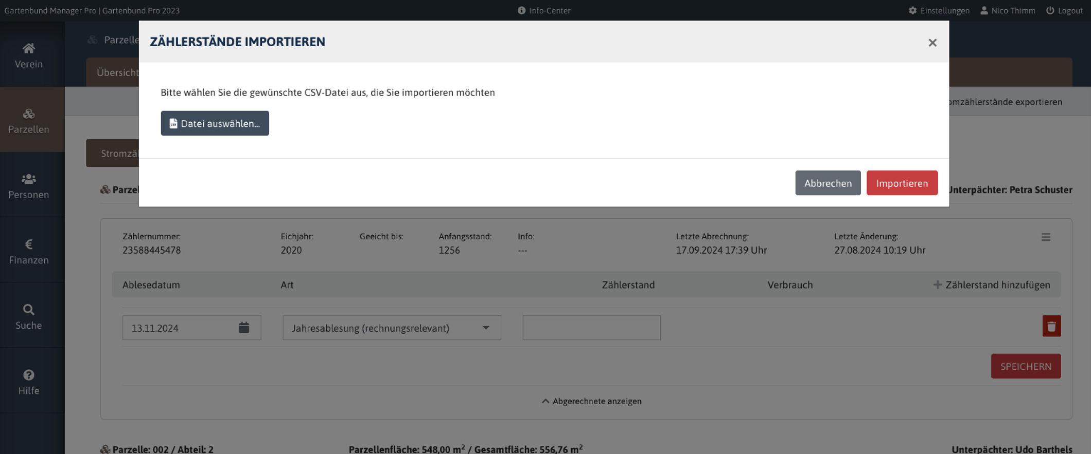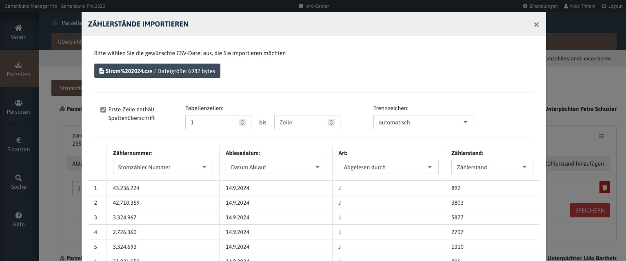 Den Datenimport für die Verbrauchsdaten können Sie unter Parzellen > Zählerstände vornehmen. Hierzu benötigen Sie eine Excel-Datei, die Sie als .csv-Datei (speichern unter) auf Ihrem Computer abspeichern. Um eine konkrete Zuordnung zu ermöglichen, benötigen Sie folgende Werte in der Excel Liste: