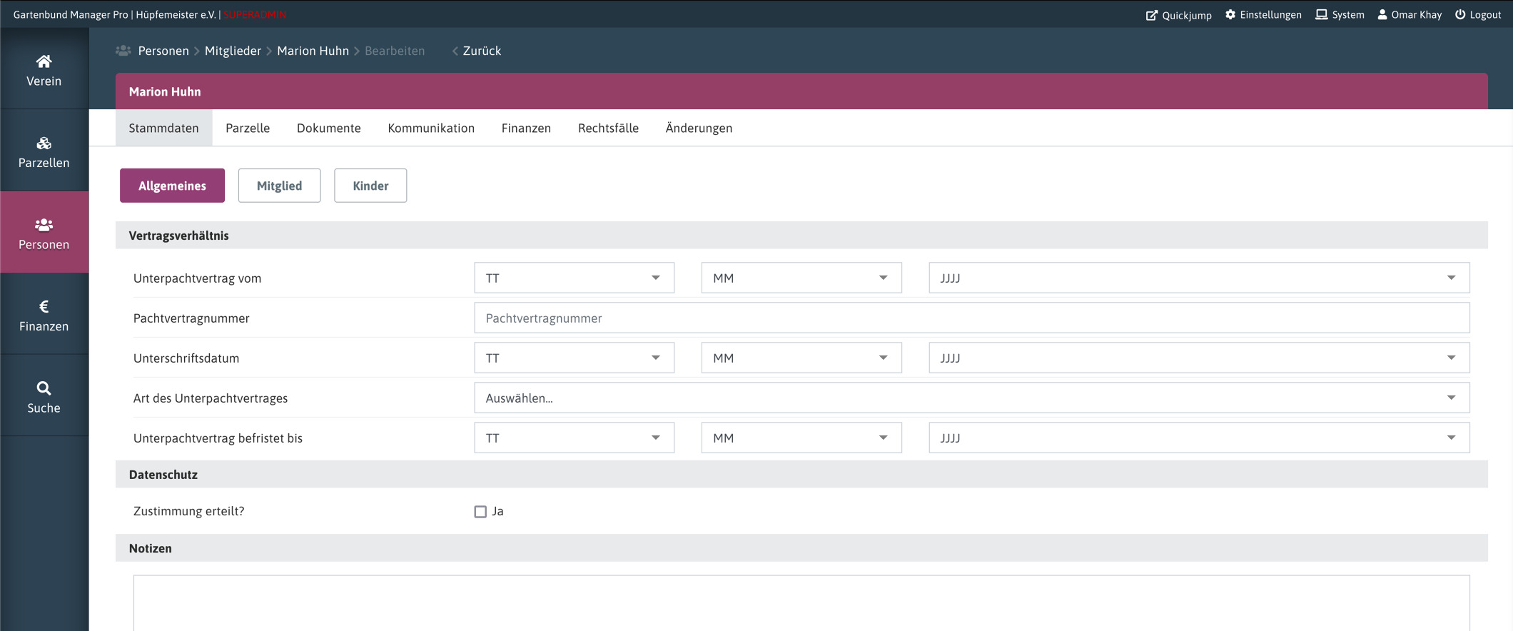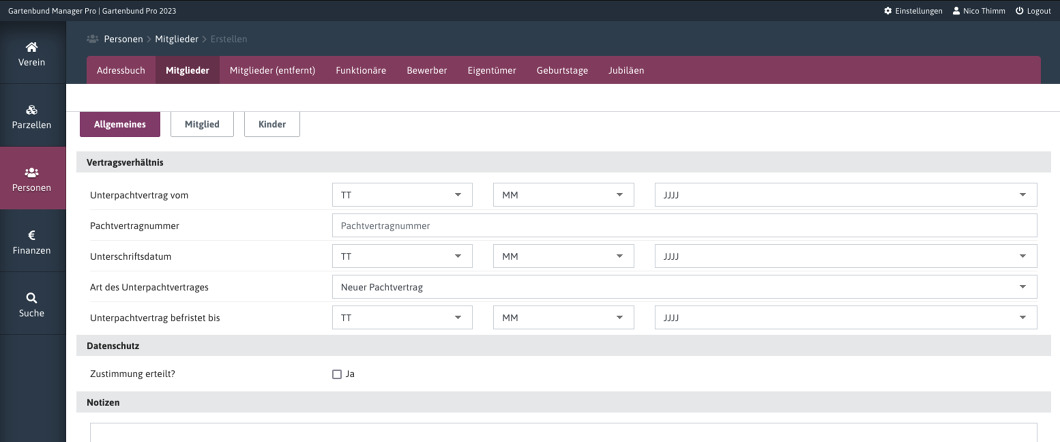Hier können Sie die Grunddaten von dem Mitglied eintragen. Das Feld Unterpachtvertrag vom ist stellvertretend für Mitglied seit. Dieses ist wichtig, da für die Berechnung von, z.B. Jubiläen dieses Datum als Berechnung genommen wird.