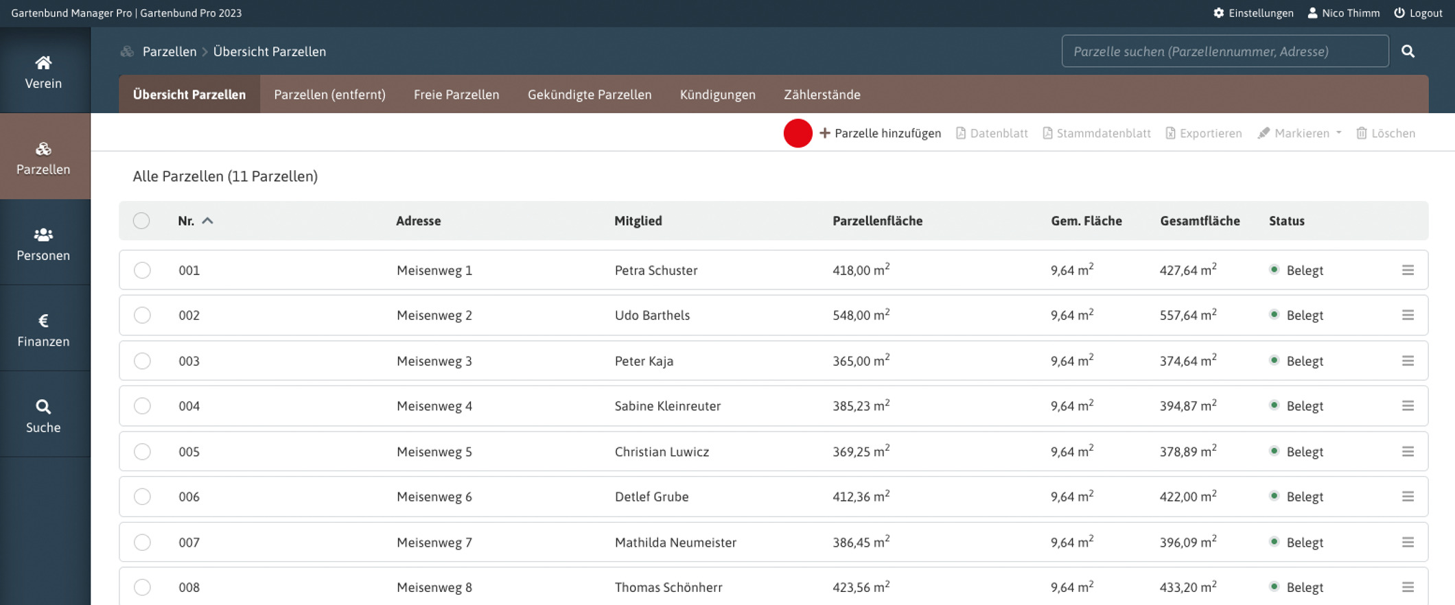 In der Reihenfolge sollten zuerst die Parzellen angelegt werden und der Status der Parzellen auf frei, bzw. gekündigt gesetzt werden. Dadurch kann beim Anlegen des Mitglieds gleich die Parzellenzuordnung erfolgen und Sie sparen sich Zeit.