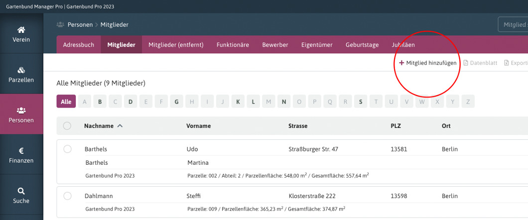 Um ein neues Mitglied hinzuzufügen, können Sie in der Mitgliederübersicht (oben rechts) ein neues Mitglied hinzufügen.
